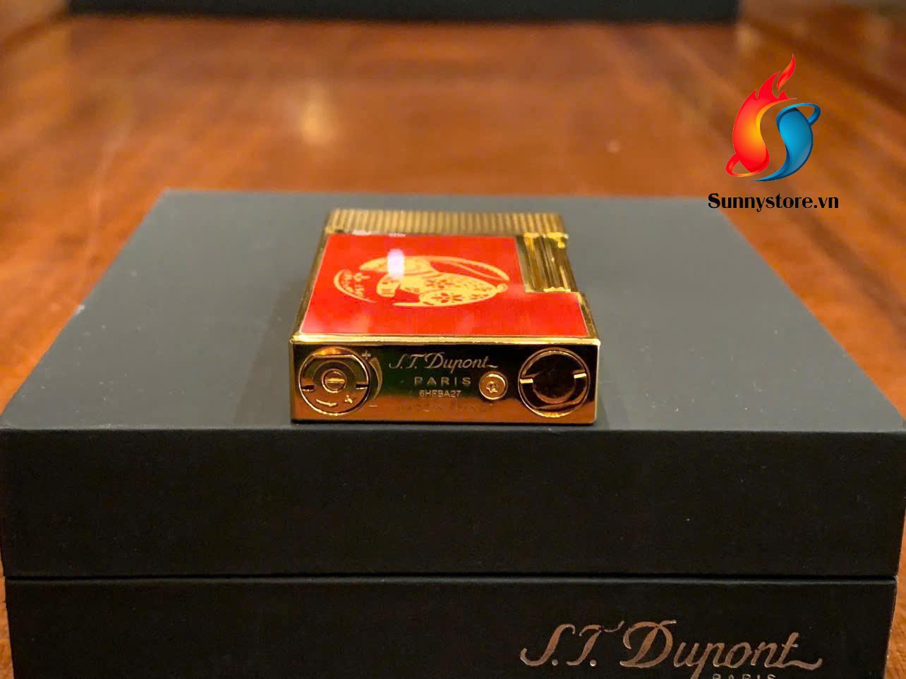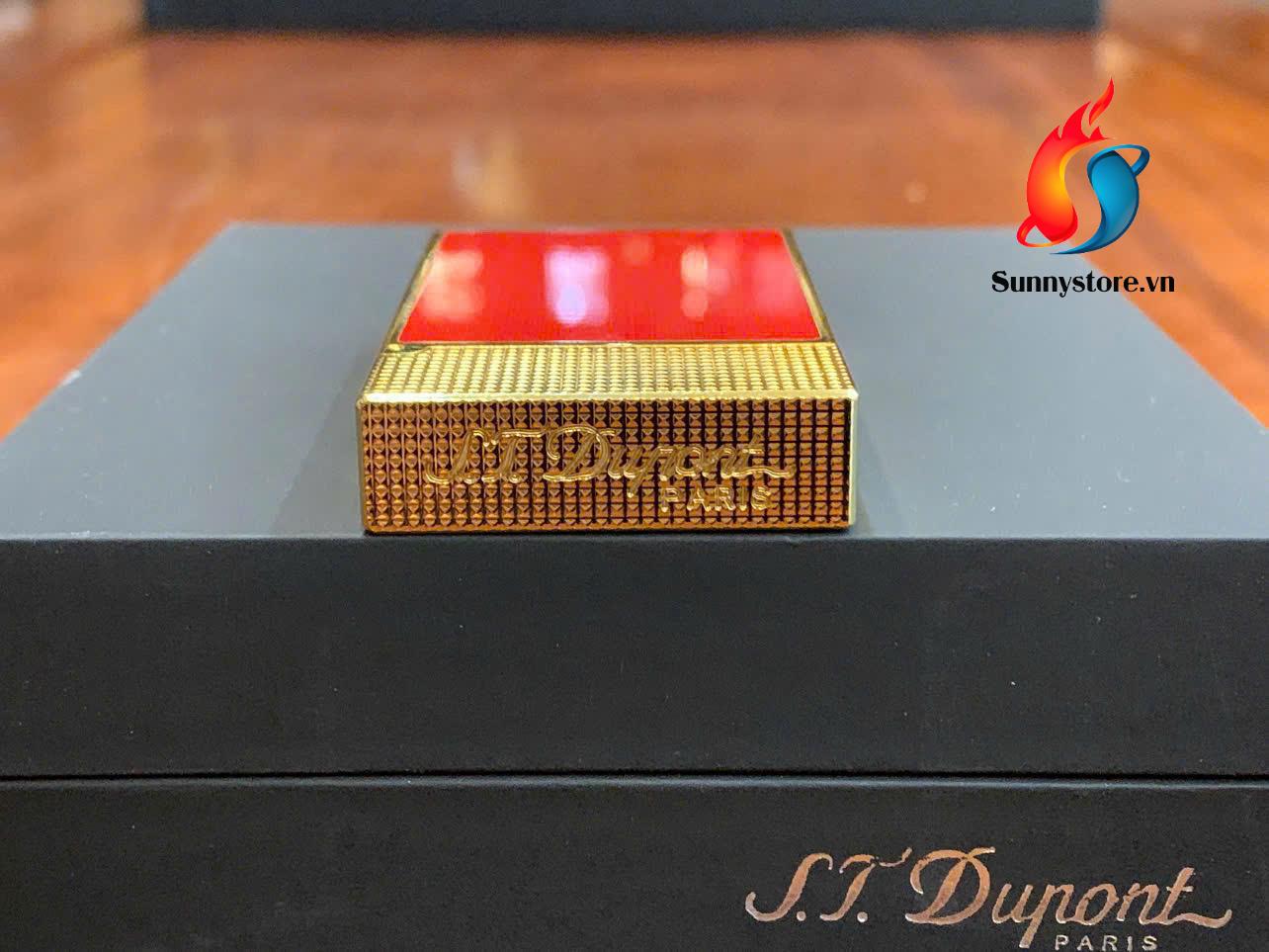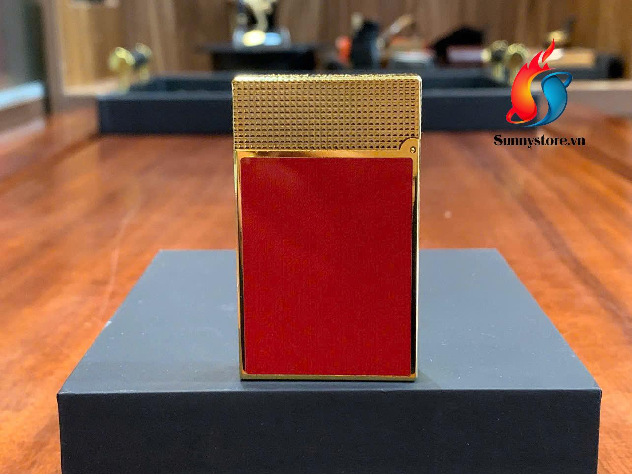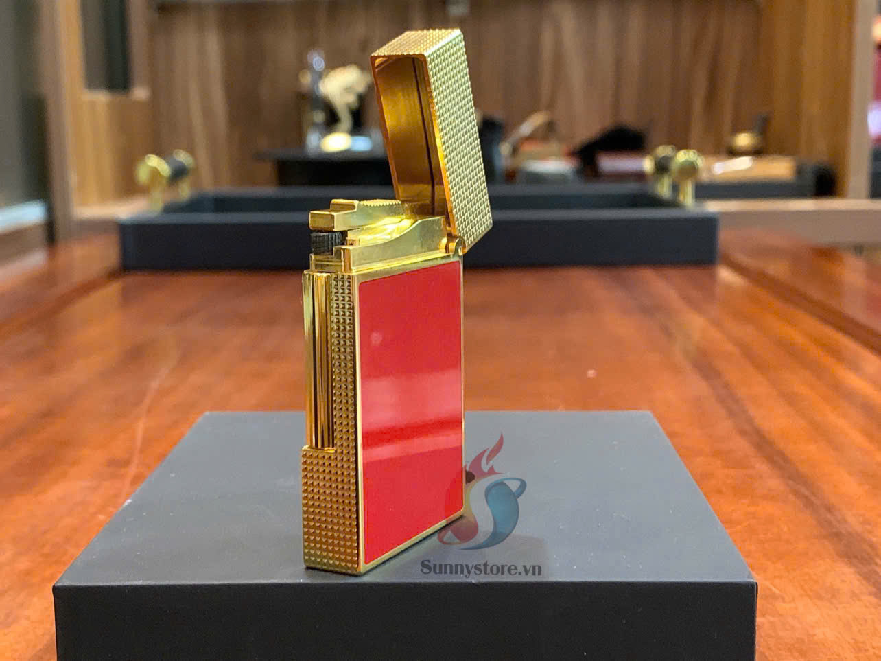 • Chất liệu cao cấp: Thân bật lửa được chế tác từ kim loại mạ vàng, kết hợp với lớp sơn mài đỏ huyền thoại của S.T. Dupont, tạo nên vẻ ngoài sang trọng và đẳng cấp.