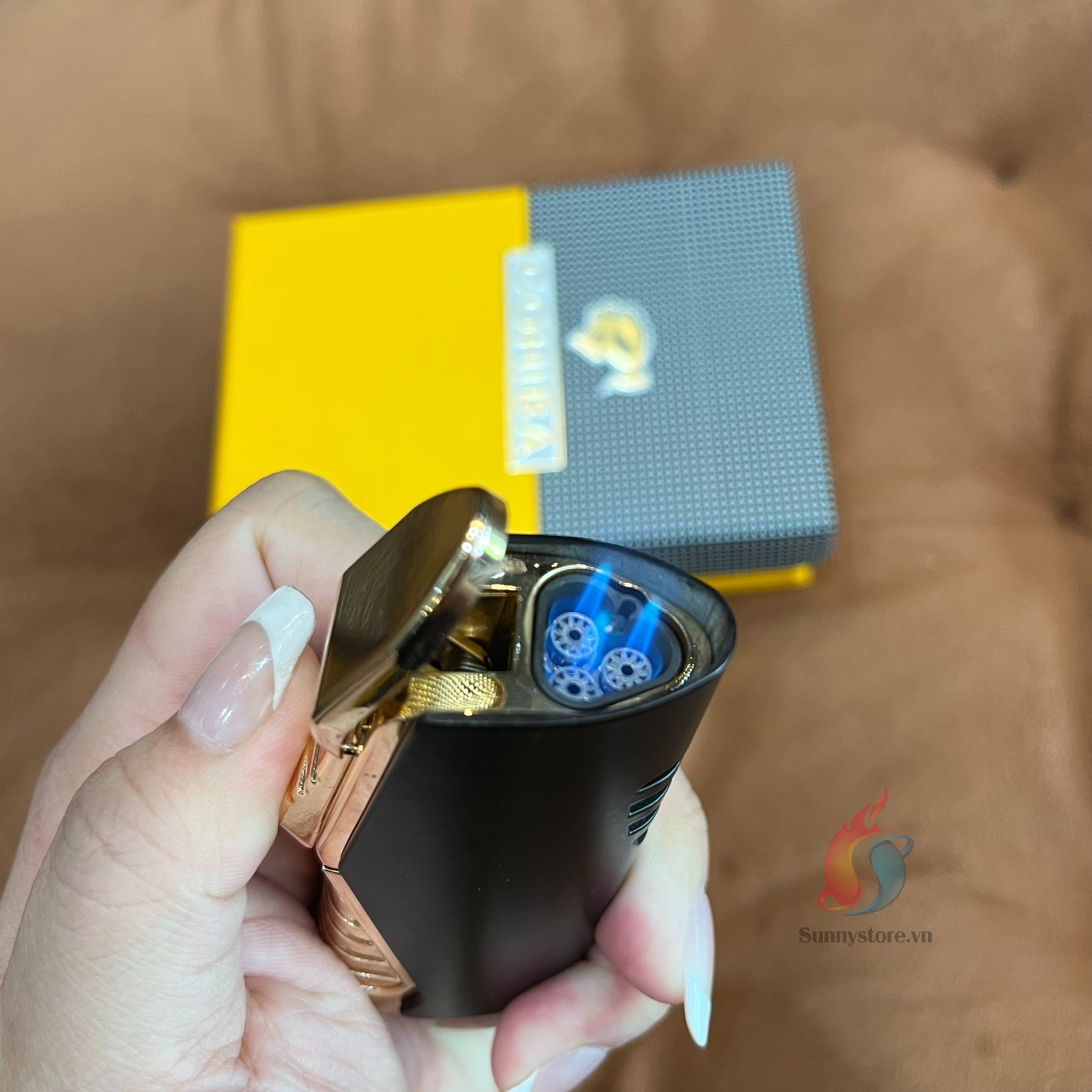 Sản phẩm hoàn thiện với lớp sơn, mạ theo nhiều màu sắc khác nhau. Sức lửa 3 tia mạnh mẽ, châm nhanh và đảm bảo hương vị tốt nhất cho điếu cigar của bạn. Hơn nữa còn kèm đục cigar tiện lợi được tích hợp dưới đáy bật lửa.