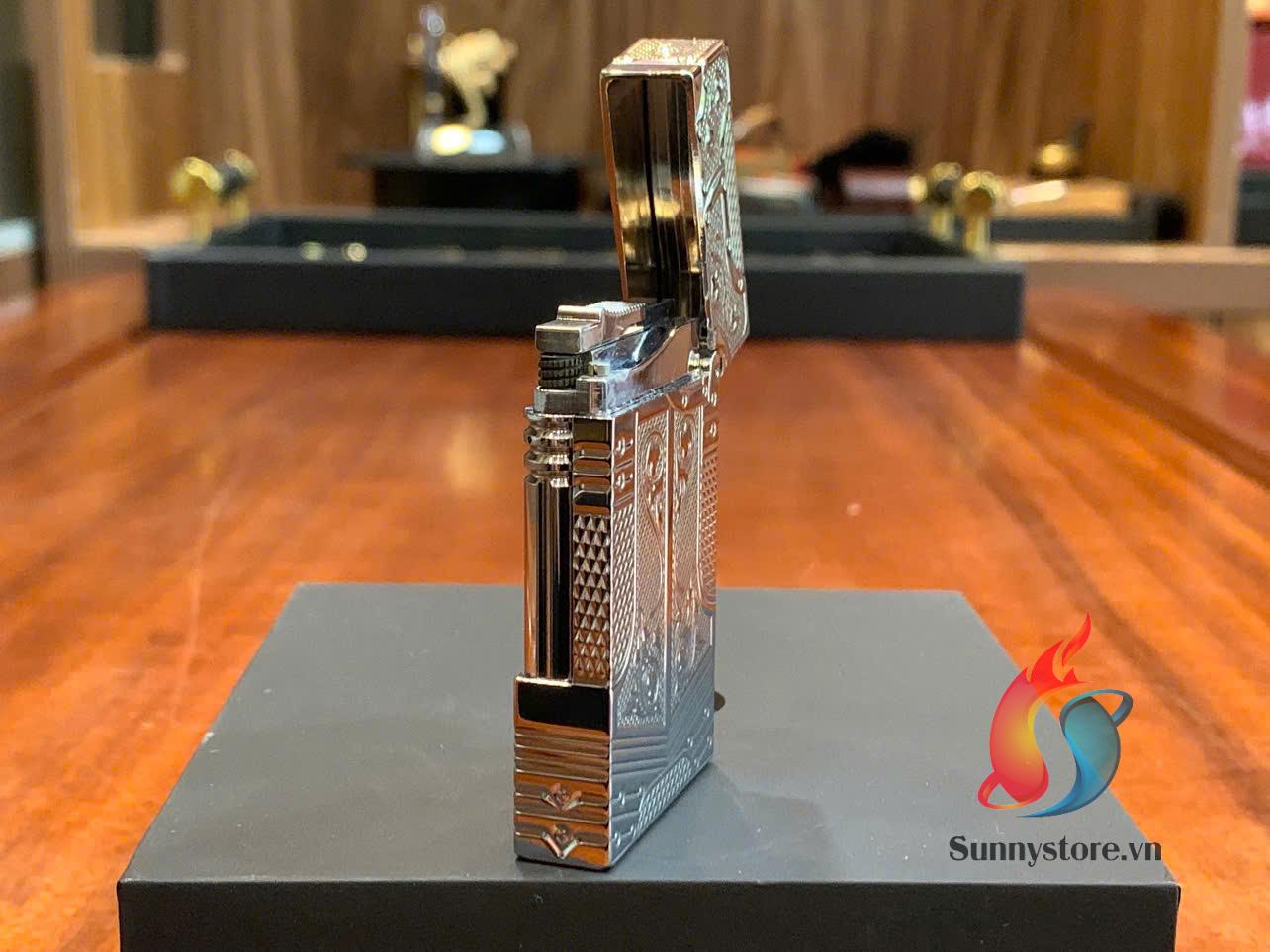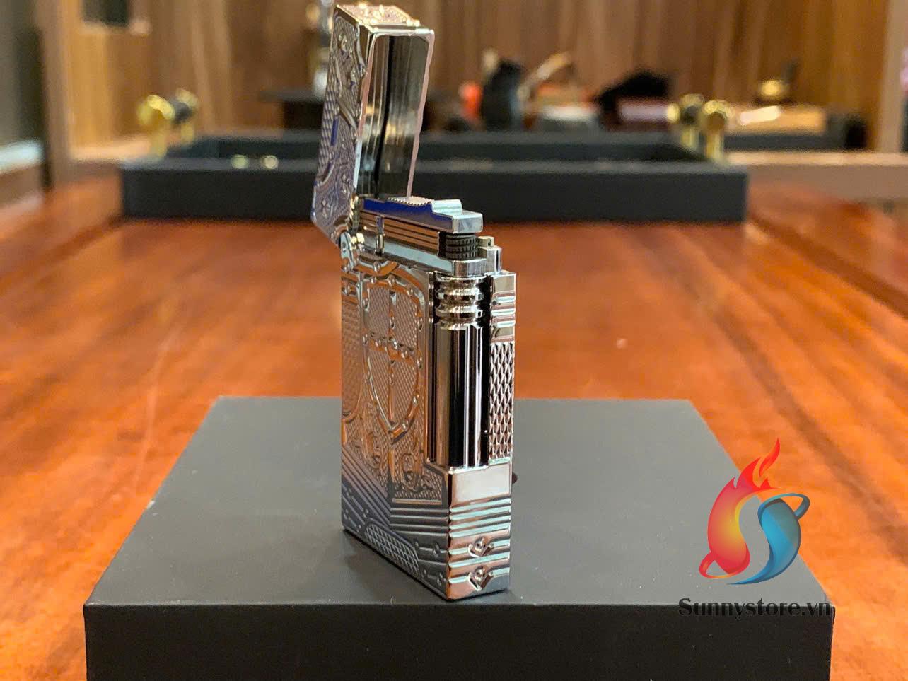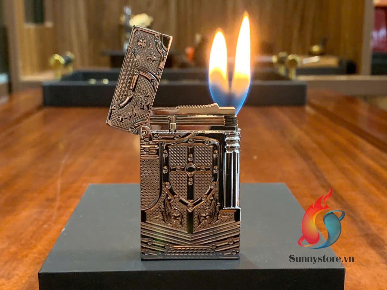 • Mặt trước bật lửa nổi bật với họa tiết hình khiên và áo giáp, tượng trưng cho sức mạnh và quyền uy.