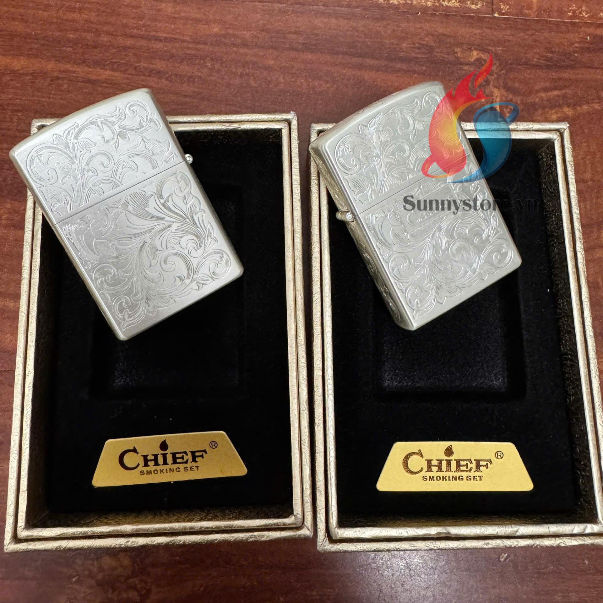 🔥Bật lửa xăng đá Chief bạc khắc hoa văn – Tối giản đẳng cấp, chất chơi không phô trương