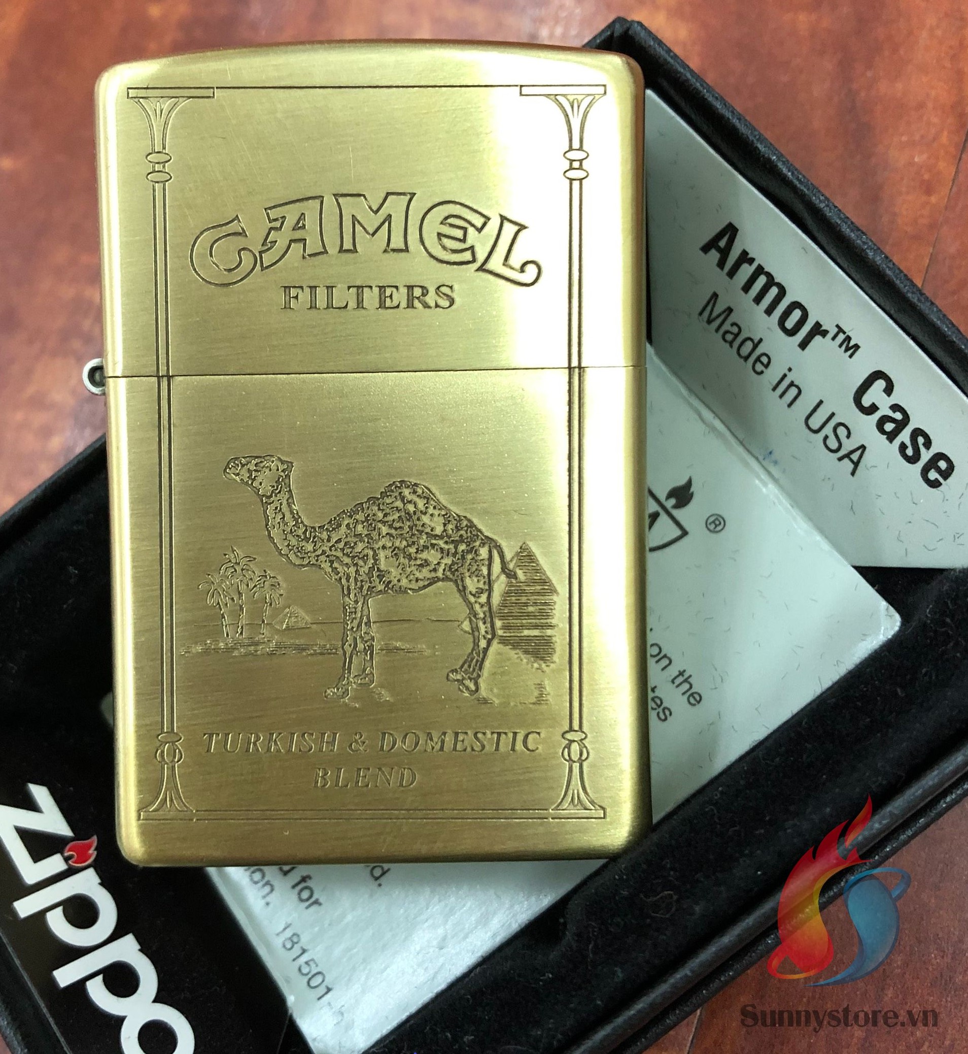 BẬT LỬA ZIPPO ARMOR LẠC ĐÀ CAMEL 5 MẶT CAO CẤP khắc ngũ diện hình công ty thuốc lá Camel quen thuộc, trên nền chất liệu đồng thau. Camel luôn là đề tài nhiều “thi vị” trên chiếc bật lửa Zippo. Với bề dày lịch sử cùng vô số câu chuyện bên lề liên quan đến văn hóa hút thuốc tại Mỹ, Camel xứng đáng đứng ngang hàng các “tượng đài Zippo” như Harley Davidson và Marlboro. Bật lửa Zippo Camel chế tác tỉ mỉ, khắc họa nhiều ưu điểm: Là sự pha trộn giữa hương vị Thổ Nhĩ Kỳ và Mỹ mang đến sự hấp dẫn lạ