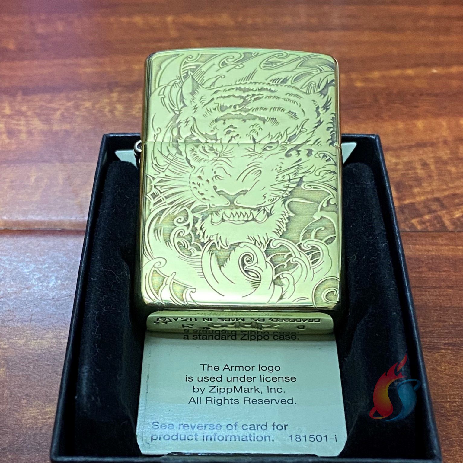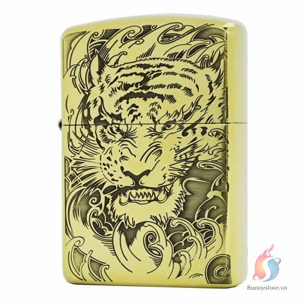 Zippo armor mặt hổ khắc ăn mòn axit 2 mặt vàng