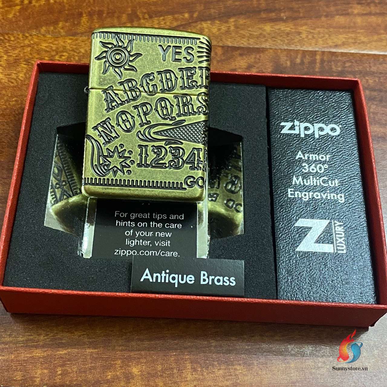 Đây chỉ là một trò chơi? Bạn sẽ là người quyết định. Chiếc bật lửa Armor® Antique Brass này có thiết kế Ouija Board bí ẩn. Sử dụng quy trình khắc MultiCut 360°, thiết kế trở nên sống động, giống như bản thân Ouija Board. Được đóng gói trong một hộp đựng dạng quà tặng. Để tối ưu hiệu suất, hãy dùng nhiên liệu bật lửa của Zippo.