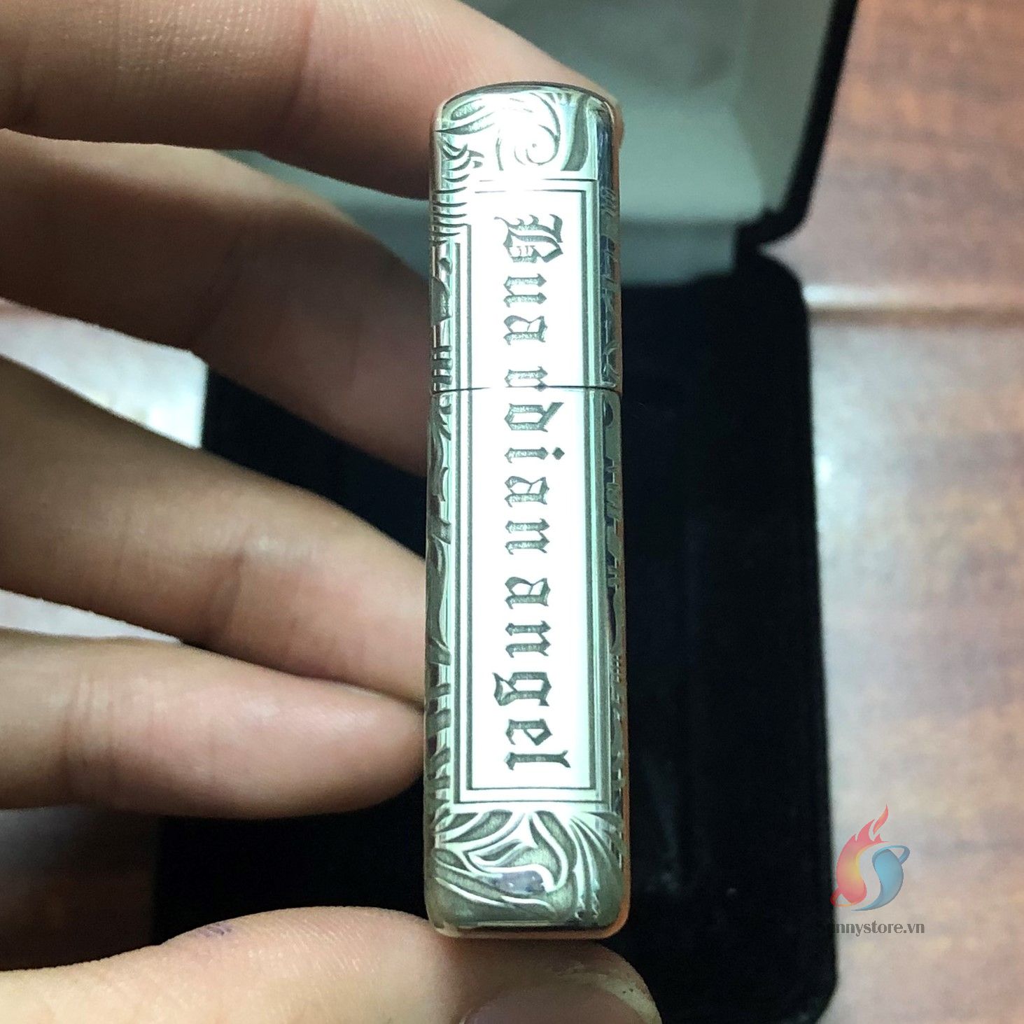 - Vỏ Zippo: Dòng vỏ bạc nguyên khối tiêu chuẩn, đầu tròn, mộc đáy lồi. Bản lề 5 chấu.
