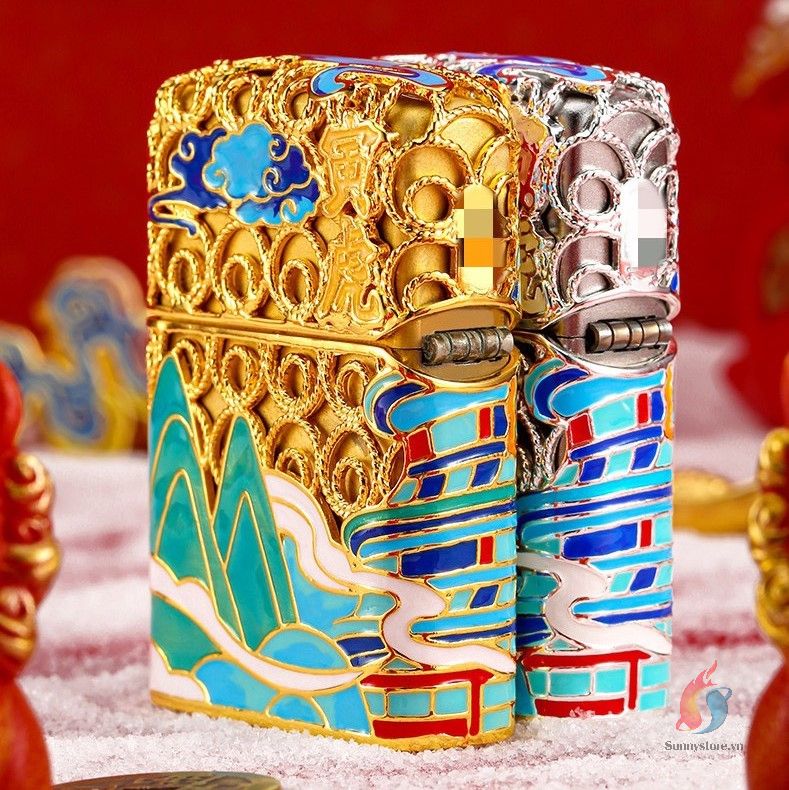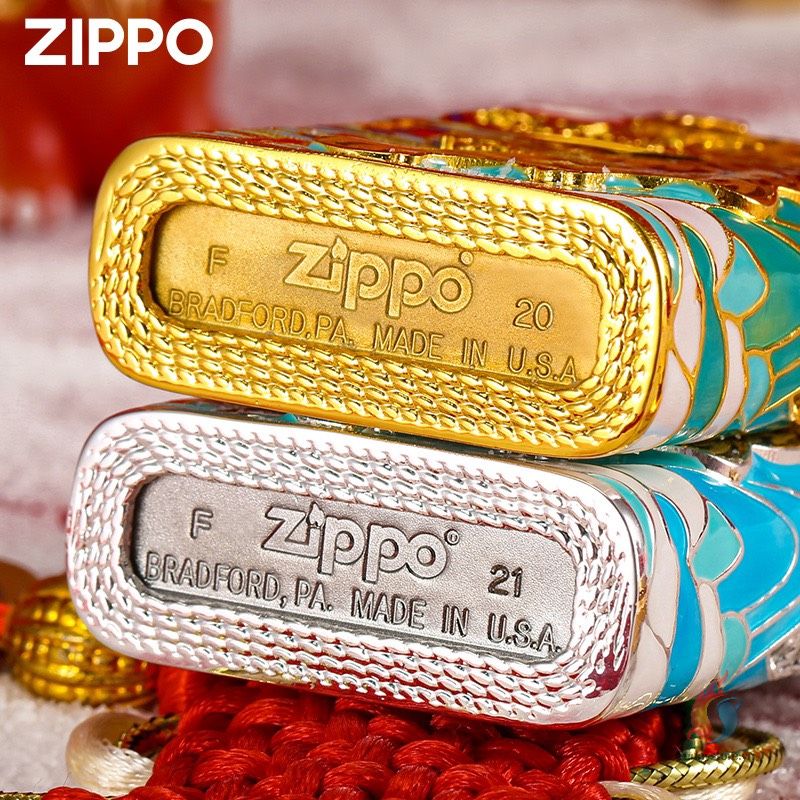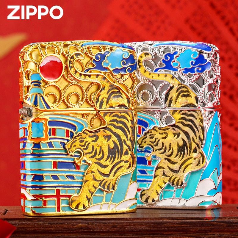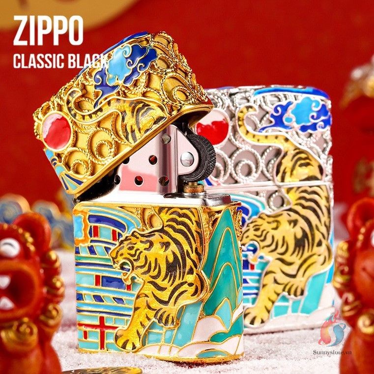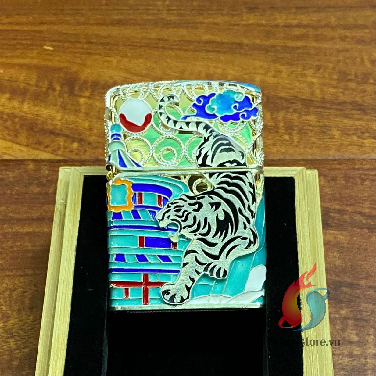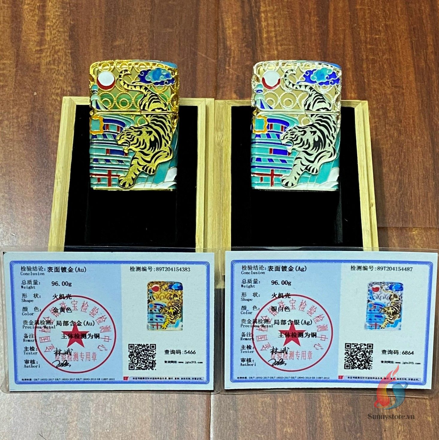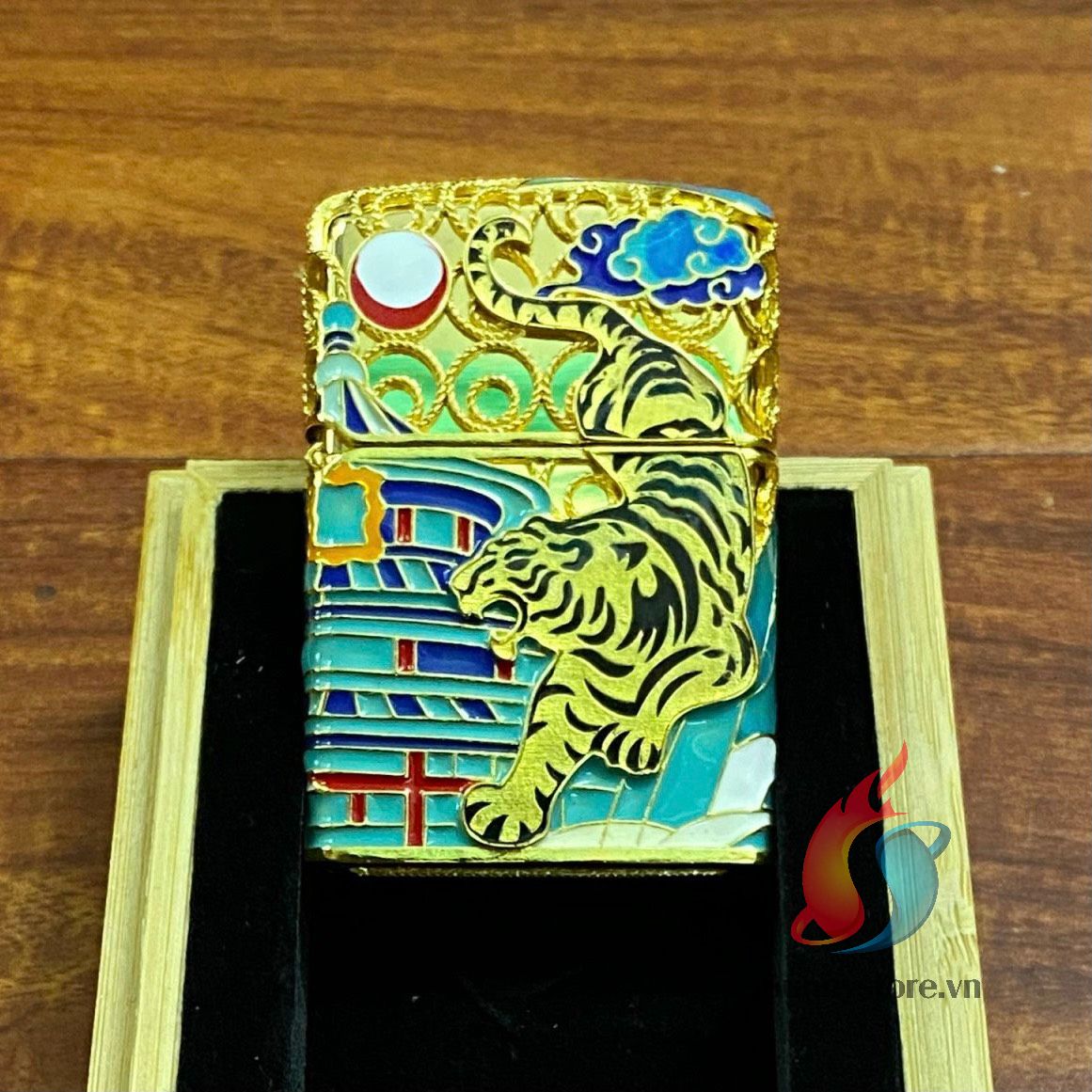 Zippo bọc vàng ốp emblem hình Hổ có dạ quang